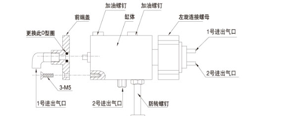5、如果在使用時發(fā)現(xiàn)夾緊工件產(chǎn)生漏氣量較大的情況,請更換小O型圈,將前端蓋3-M5螺釘拆除,換下在前端蓋中孔內的小O型圈(規(guī)格d9×1.8氟橡膠,如購買不到,請與我公司聯(lián)系),然后再將前端蓋旋緊于原來的狀態(tài),見示意圖;